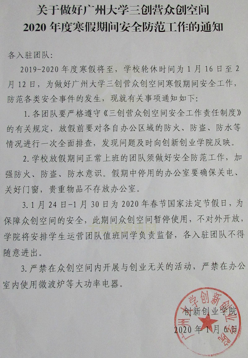 | 关于做好广州大学三创营众创空间2020年度寒假期间安全防范工作的通知 | ||||||