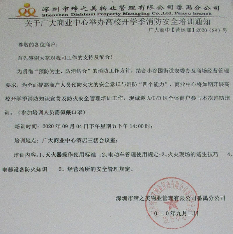 | 关于广大商业中心举办高校开学季消防安全培训通知 缔之美物业2020.09.02 | ||||||