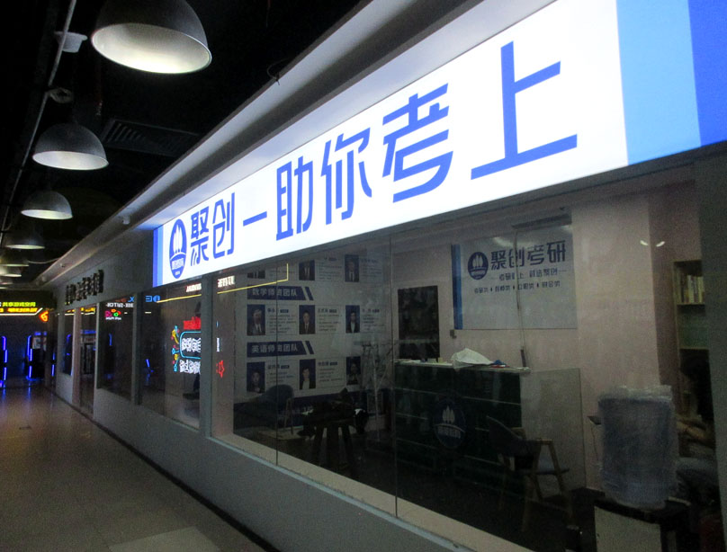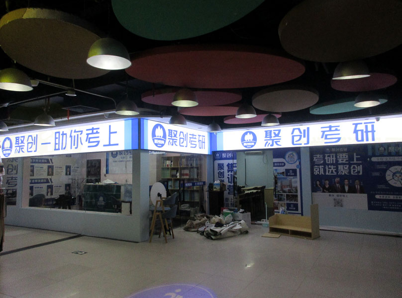 广大商中D区二楼北 原夏雪儿潮流生活馆店面 看到东侧大部空间已装修成聚创考研培训工作室或上课教室 现场看到还在整理打点,还有些首尾没完全装饰布置好
