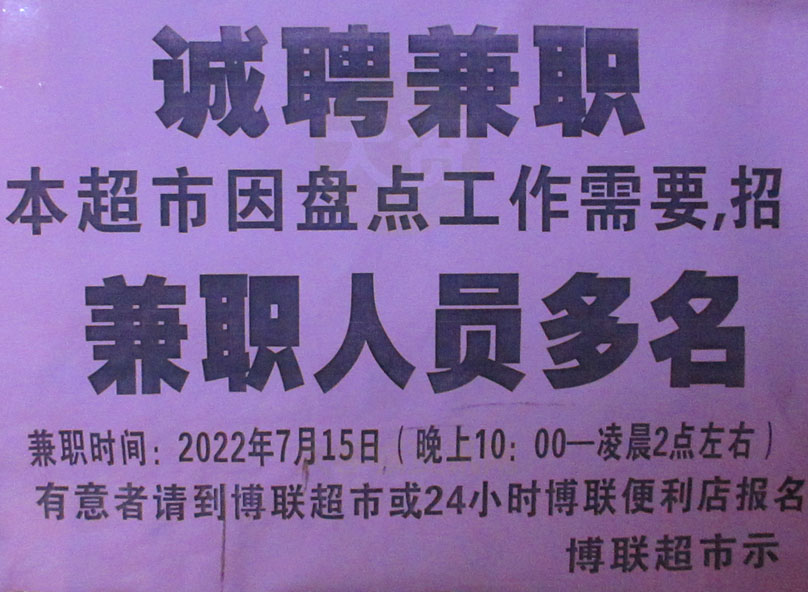 | 博联超市 诚聘兼职 本超市因盘点工作需要,招兼职人员多名 兼职时间2022年7月15日 | ||||||