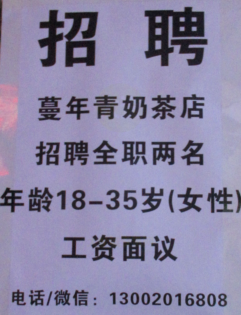 | 广大商中D区北侧外廊道 蔓年青茶饮店 招聘全职两名 年龄18-35岁(女性) 工资面议 电话&微信:13002016808 | ||||||