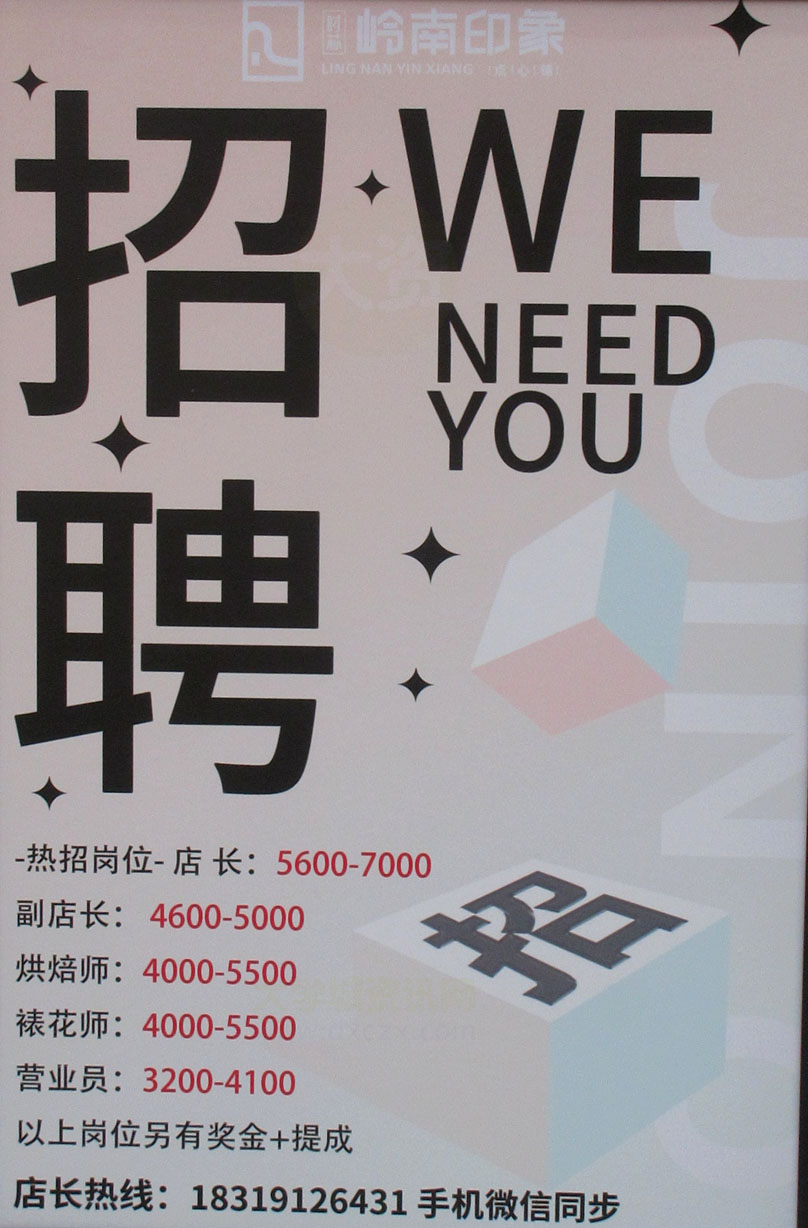 岭南印象蛋糕店 招聘 店长5600-7000 副店长4600-5000 烘焙师4000-5500 裱花师4000-5500 营业员3200-4100 以上岗位另有奖金+提成 店长热线18319126431(微信)