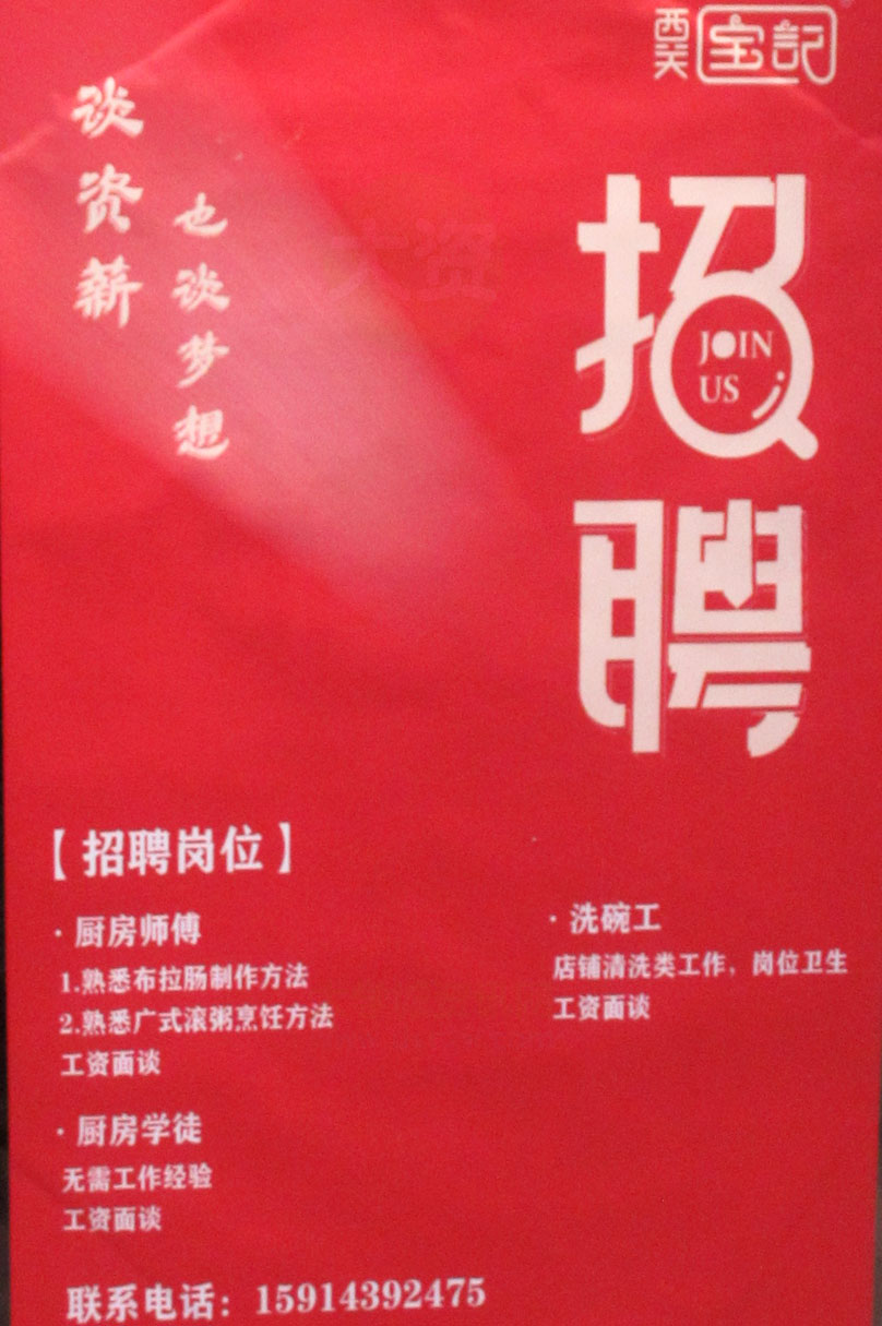 | 广大商中A区东列中 西关宝记肠粉粥 招聘岗位:厨房师傅 厨房学徒 洗碗工 联系电话15914392475 | ||||||