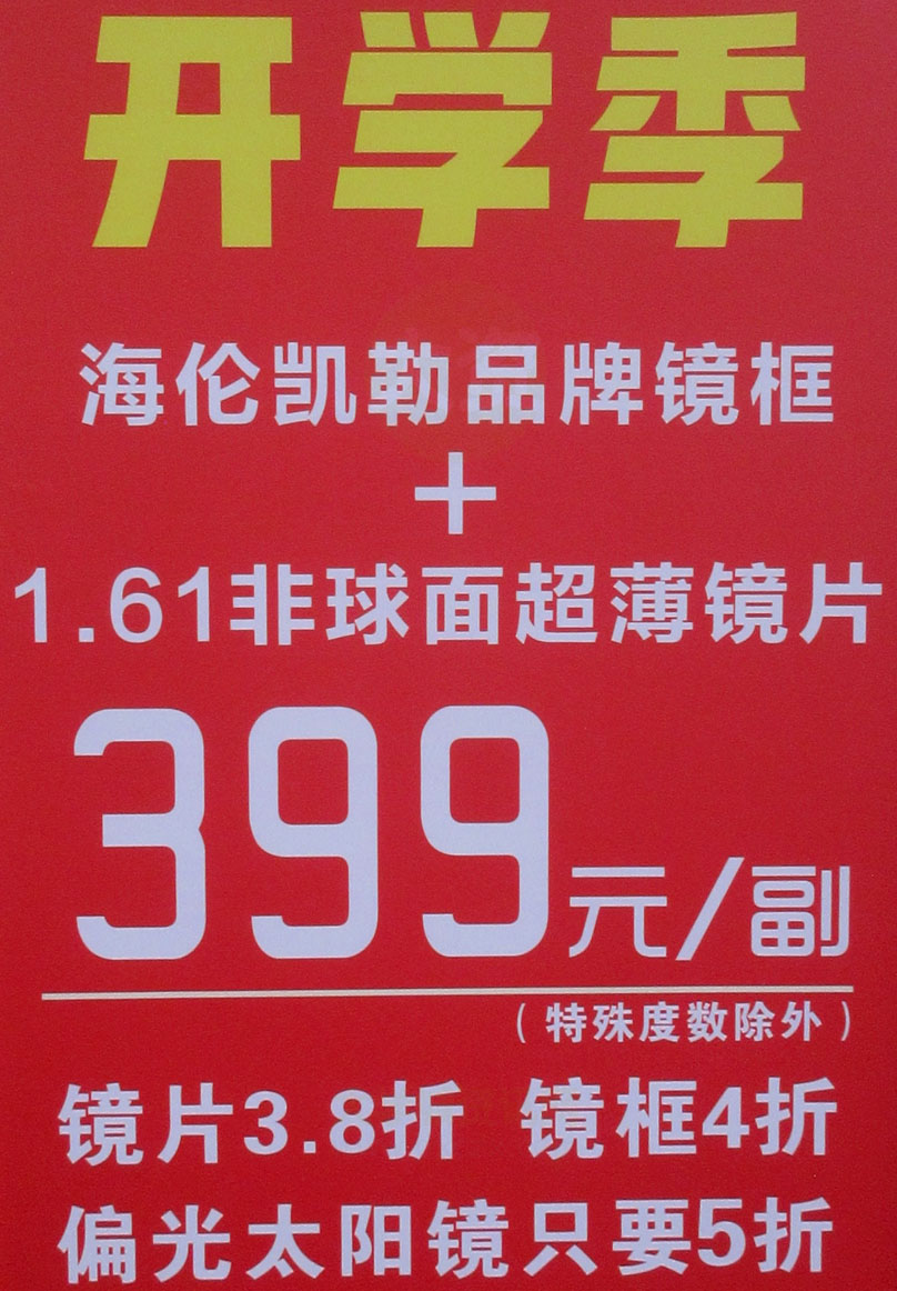 | 广大商中D区西北角 快取眼镜超市 开学季 海伦凯勒品牌镜框+1.61非球面超薄镜片 399元一副(特殊度数除外) 镜片3.8折 镜框4折 | ||||||
