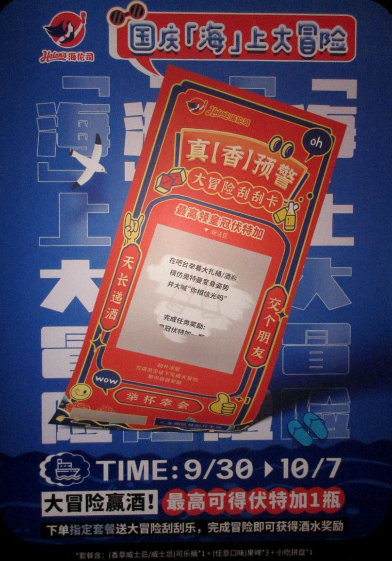广大商中D区三楼南楼梯上 海伦司小酒馆 国庆海上大冒险赢酒 最高可得伏特加1瓶 时间9.30-10.7 下单指定套餐送大冒险刮刮乐,完成冒险即可获得酒水奖励
