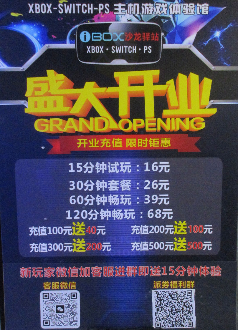 | 广大商中D区二楼西北角 看到也新开了一家游戏机室,名叫iBOX沙龙驿站,看前缀主要是玩XBOX-SWITCH-PS主机游戏体验 | ||||||