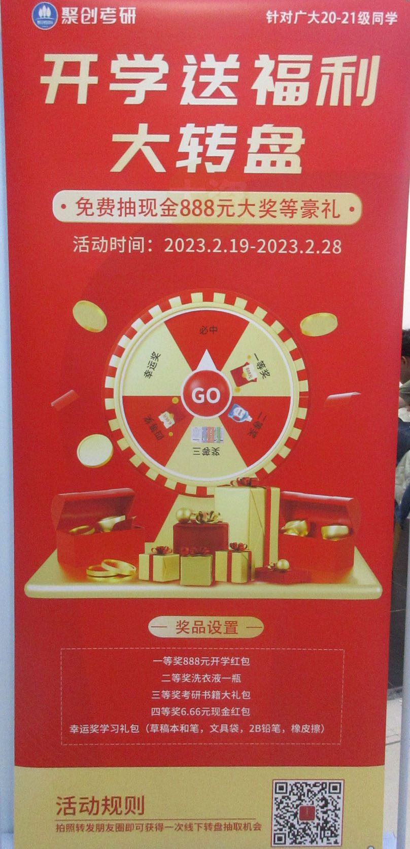 | 广大商中D区二楼北&近电梯口旁 聚创考研 开学送福利 大转盘 免费抽现金888元大奖等好礼 活动期2023.2.19-2.28 面向广大20级21级学生 | ||||||