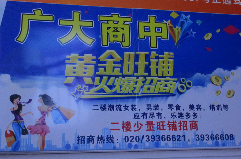 广大商中D区二楼潮流女装,男装,零食,美容,培训等 少量旺铺招商 招商热线020-39366621 39366608 |