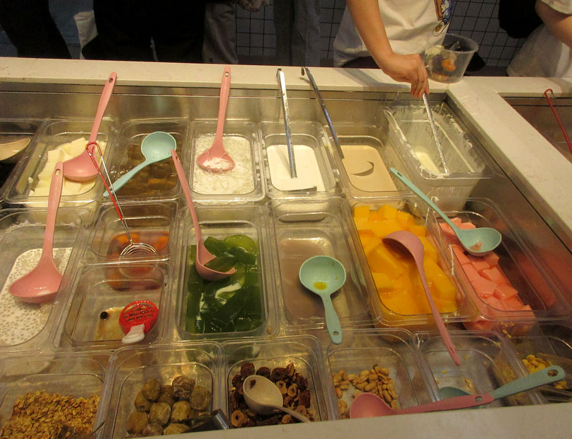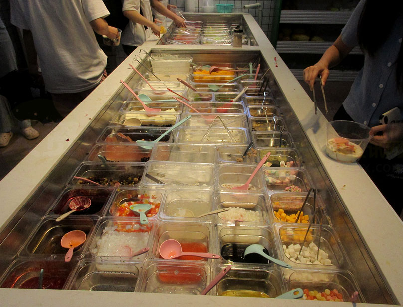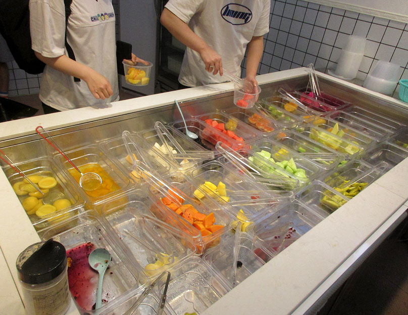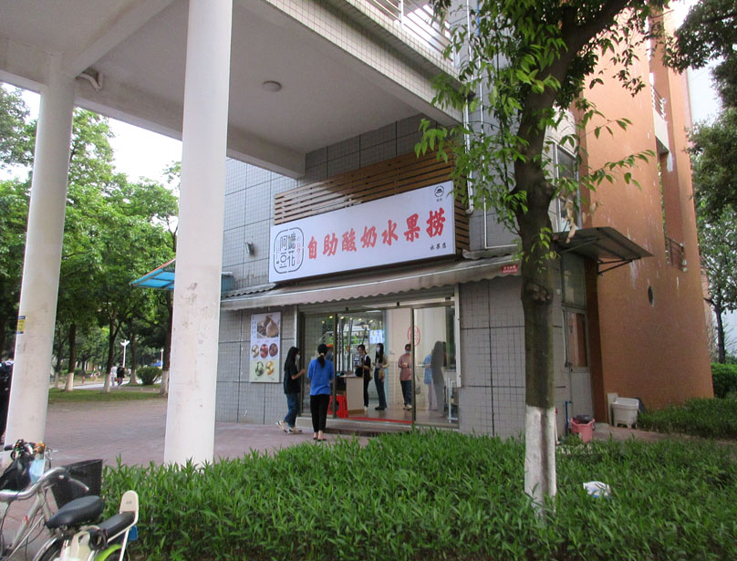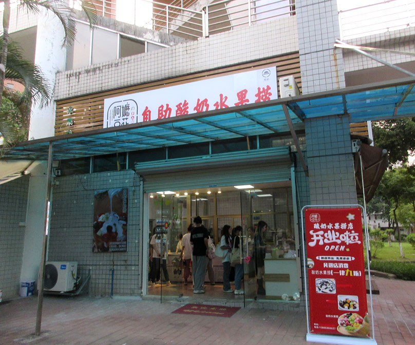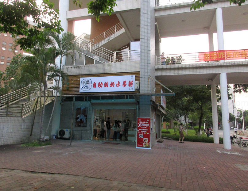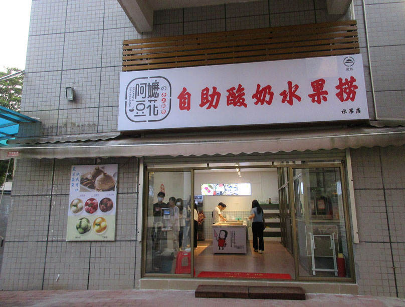 广外一饭(文采园)西南角外延楼梯廊台下一楼-原果色果香水果店(铺位)重新装修后已新店开业,好像已经不是卖水果了,而是主营酸奶水果捞,店名也改成阿嬷豆花;先前装修时听说还是原来的水果店
