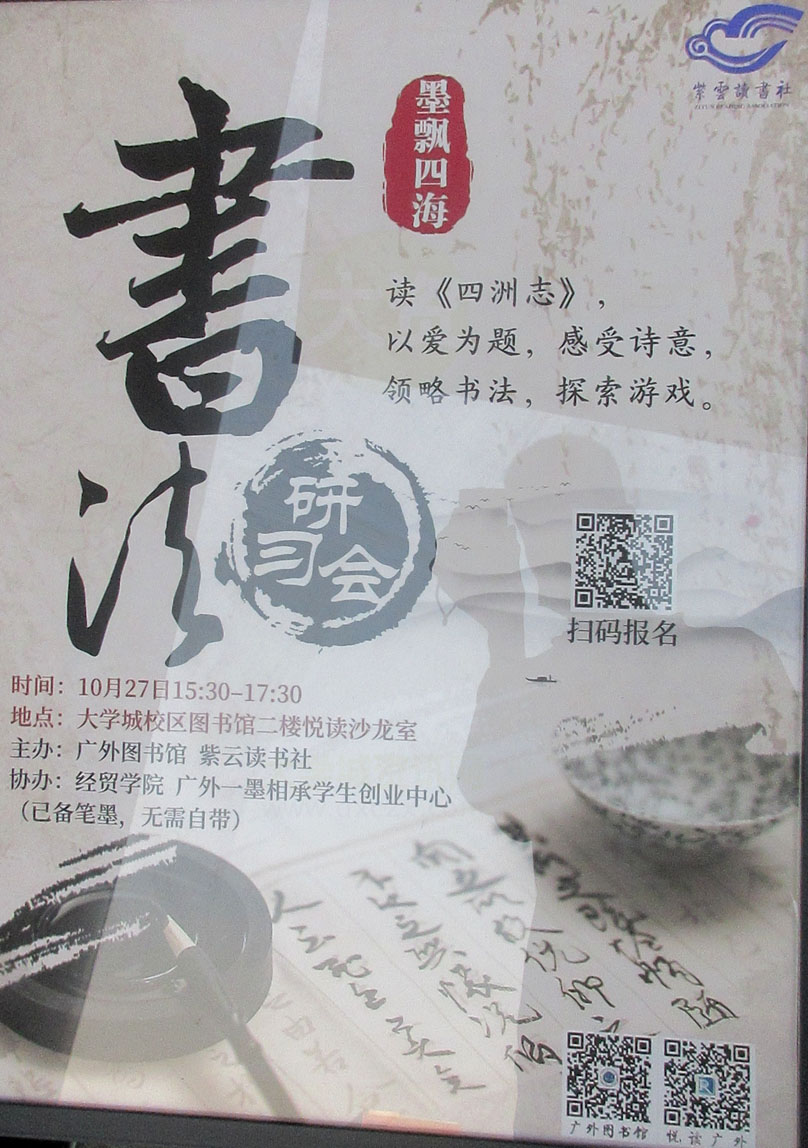 | 紫云读书社 书法研习会 墨飘四海 读《四洲志》,以爱为题,感受诗意,领略书法,探索游戏 时间:10月27日周四下午15点30-17点30 图书馆二楼悦读沙龙厅 | ||||||