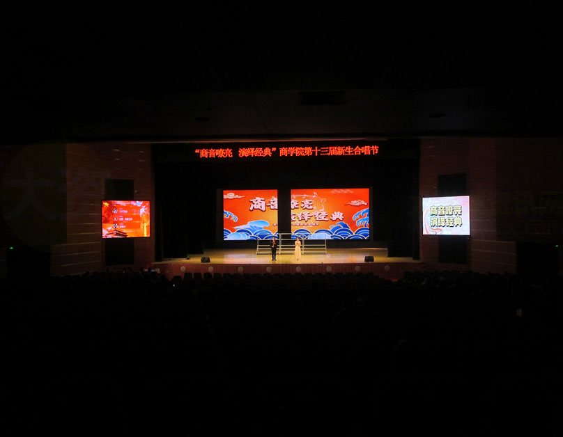 广外商学院第十三届新生合唱节今晚在教学区大会堂进行 先前预告的原本今晚是金融学院的迎新晚会在大会堂进行听说是推迟延期了 可能是大会堂太久没有进行活动晚会演出等,似乎屏幕也有些小不在状态