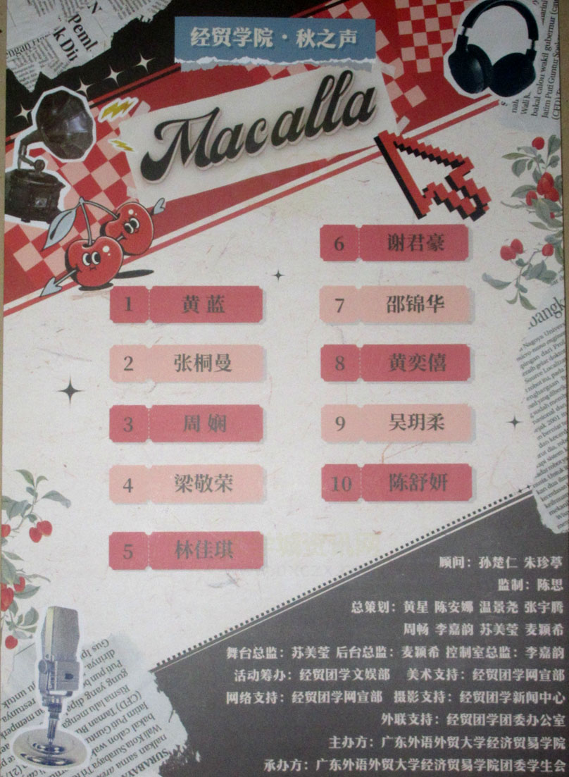 广外-经济贸易学院第二十九届Macalla秋之声歌唱比赛决赛今晚在生活区学活-多功能活动厅进行 789号顺位出场选手恰分获最终前三名&冠亚季军 邵锦华 黄奕僖 吴玥柔