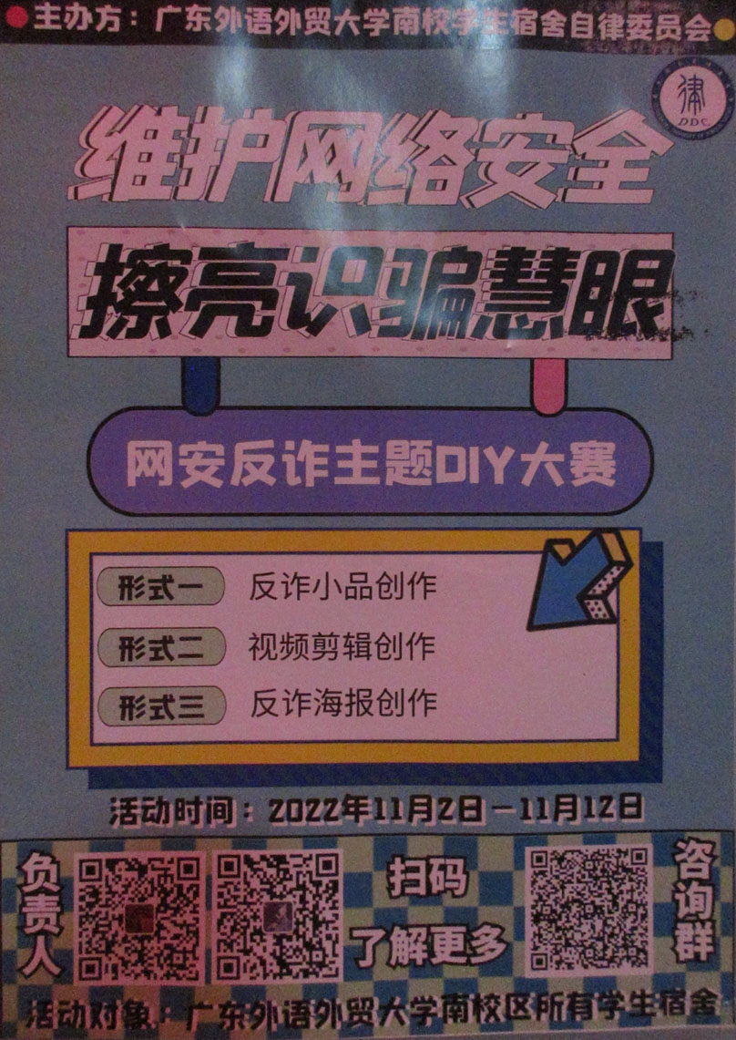 | 维护网络安全,擦亮识骗慧眼·网安反诈主题DIY大赛 2022.11.02-11.12 扫码了解更多 | ||||||