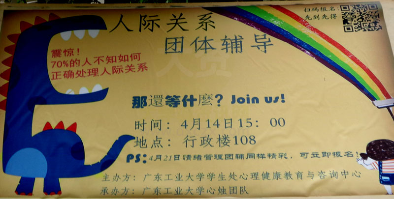 | 人际关系团体辅导 4月14日15:00 行政楼108 心烛团队 | ||||||