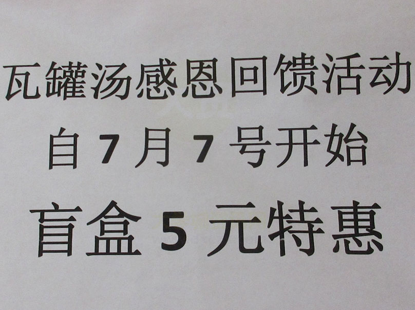 | 西区四饭一楼 瓦罐汤感恩回馈活动 自7月7号开始 盲盒5元特惠 (卖汤也玩盲盒?) | ||||||