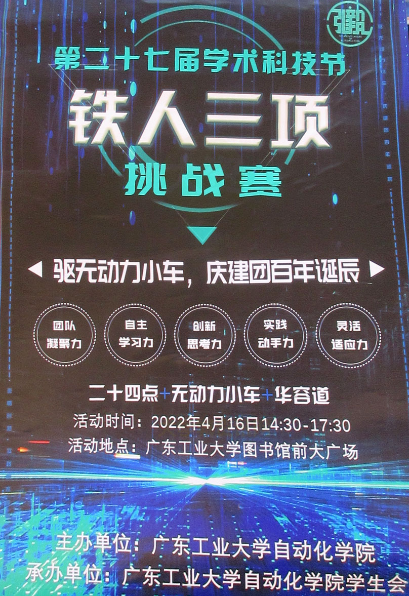 广工 自动化学院 第二十七届学术科技节铁人三项挑战赛(二十四点+无动力小车+华容道) 2022年4月16日14点30分-17点30分 广工图书馆正门东广场