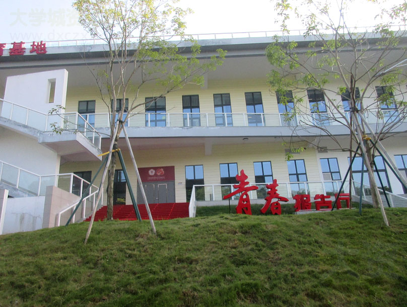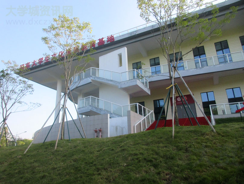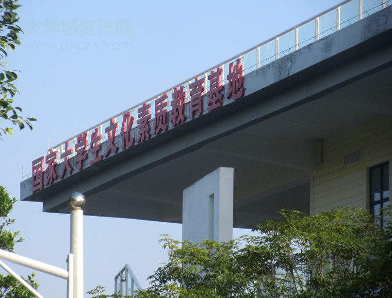 | 广工文化活动中心楼外立面东北角-北侧呈现:国家大学生文化素质教育基地 提示标语 楼下对应是外侧上转楼梯和刚最新装修好的青春报告厅 | ||||||