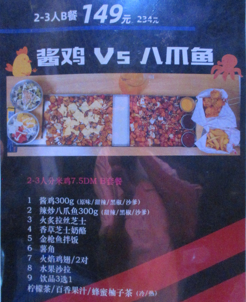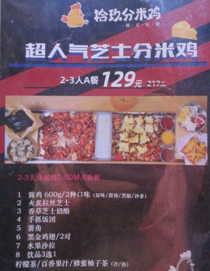 新天地二期一楼外西廊道中 拾玖韩式创意料理 近期推荐 辣酱八爪鱼肥牛 芝士辣酱春川鸡 2-3人A套餐特价129元(原价217元):超人气芝士分米鸡 2-3人B套餐特价149元(原价234元):酱鸡Vs八爪鱼系列