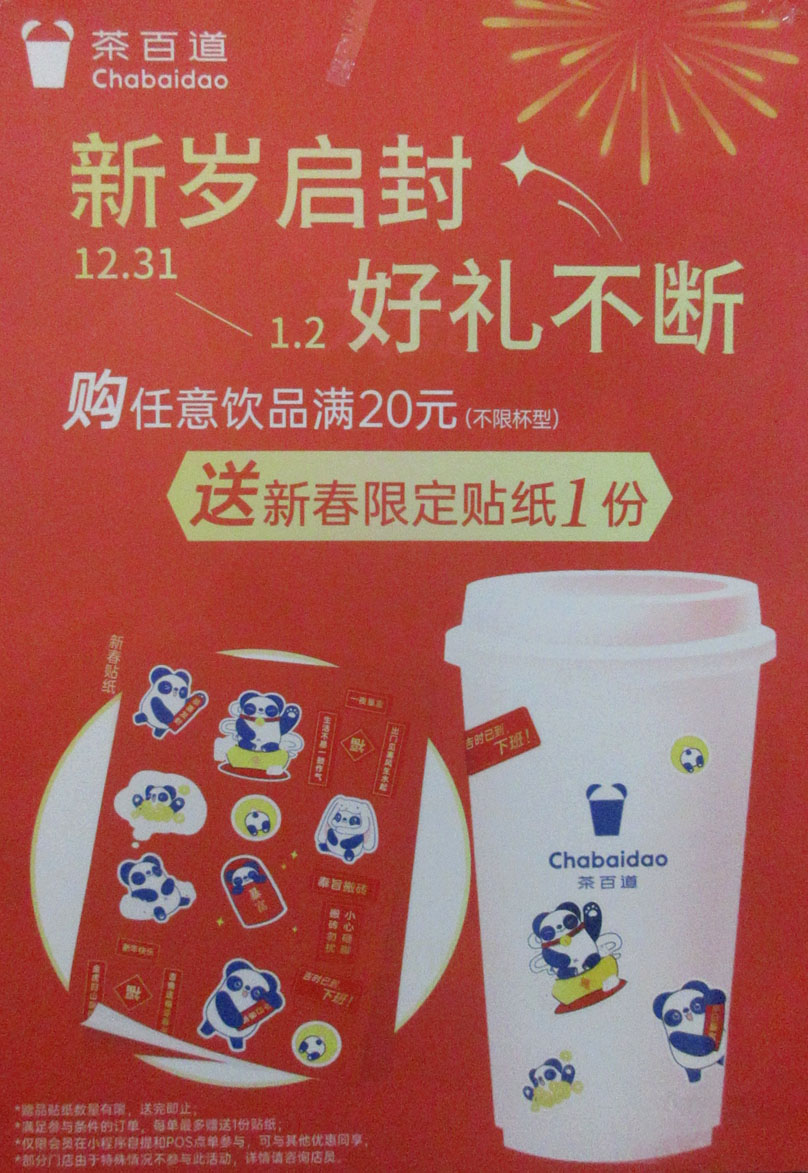 新天地西街内列中 茶百道 首款牛乳生酪系列 生酪鲜草莓&茉莉生酪奶绿;元旦假期,购任意饮品满20元送新春限定贴纸1份