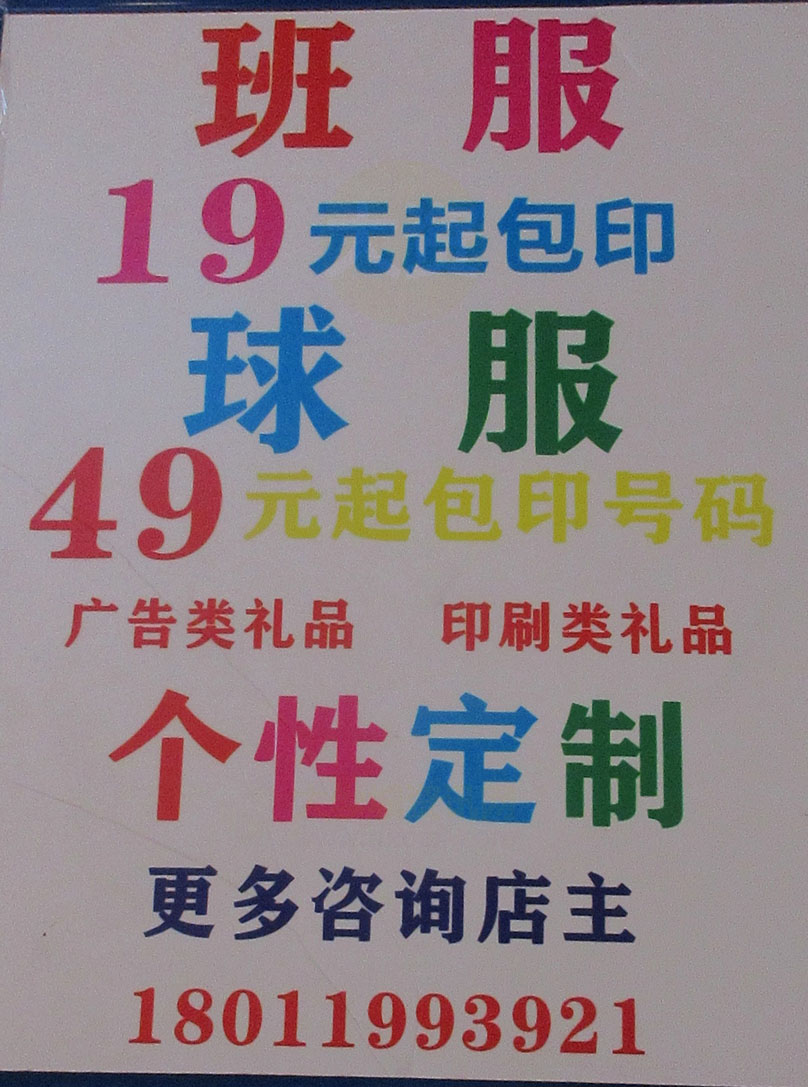 | 新天地一期北部偏东 超越体育 班服19元起包印 球服49元起包印号码 广告类印刷类礼品个性定制 更多需求到店咨询or电话18011993921 | ||||||