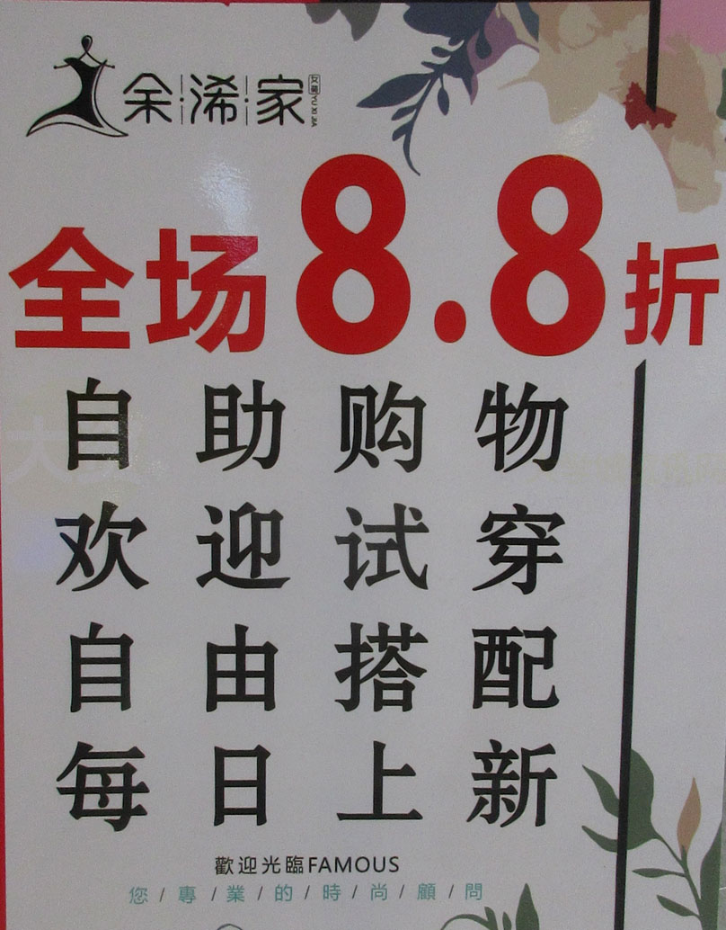 | 新天地一期一楼内东列南 余浠家女装服饰 全场8.8折 自助购物 欢迎试穿 自由搭配 每日上新 | ||||||