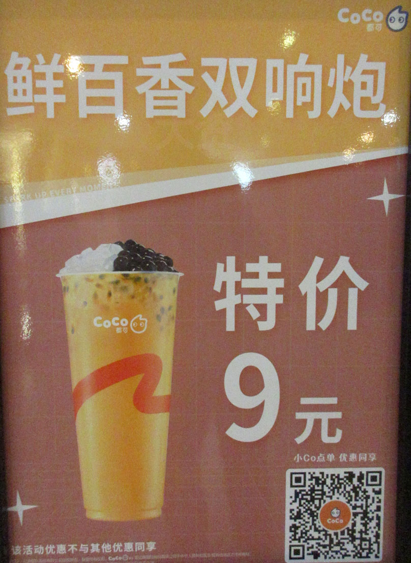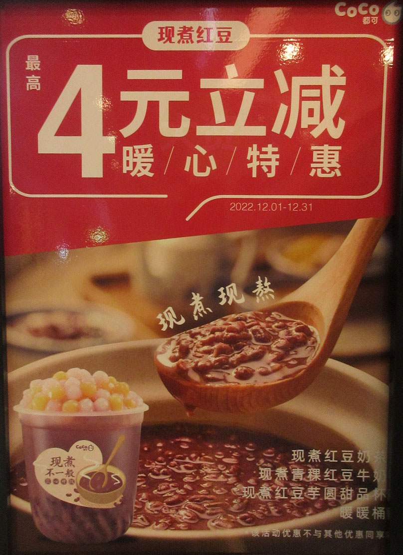 新天地三楼餐饮区南西内转角 CoCo都可奶茶店 鲜百香双响炮特价9元;现煮红豆系列暖心特惠,最高立减4元 12.01-12.31