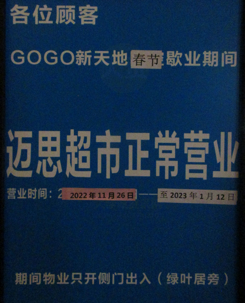 | 新天地二期一楼内 迈思超市 正常营业至2023年1月12日 入口从二期西南门进 | ||||||