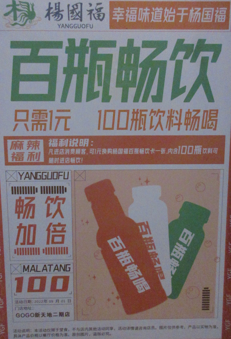 新天地二期新翼二楼西廊道北 杨国福麻辣烫 百瓶畅饮 只需1元,100瓶饮料畅喝 福利说明:凡进店消费顾客,可1元换购杨国福百瓶畅饮卡一张,内含100瓶饮料可随时进店畅饮