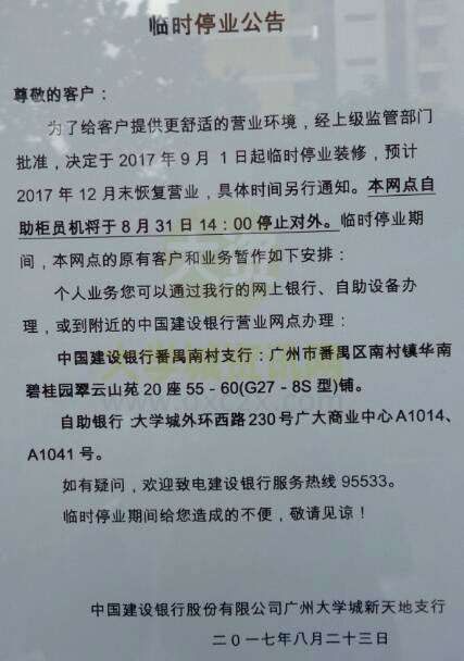 | 建行大学城总行总营业厅9.1起停业装修(ATM也同时不能使用),预计要12月底才恢复营业 | ||||||