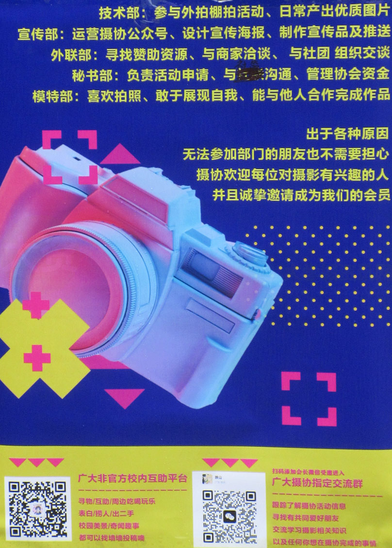 | 广大2022百团招新 摊位现场之摄影协会 具体位置所在:兰苑1栋东南角南侧对出路边辅道 | ||||||