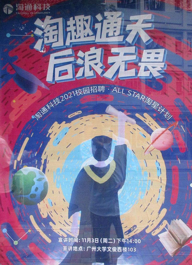 | 广大-淘通科技2021校园招聘 宣讲时间:11月3日(周二)下午14:00 地点:文俊西楼103 | ||||||