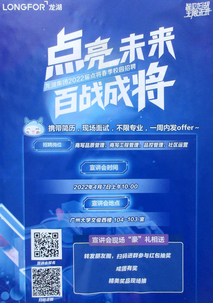 广大 龙湖集团2022届春季校园招聘2022年4月7日上午10点 文俊西楼104-103室 |