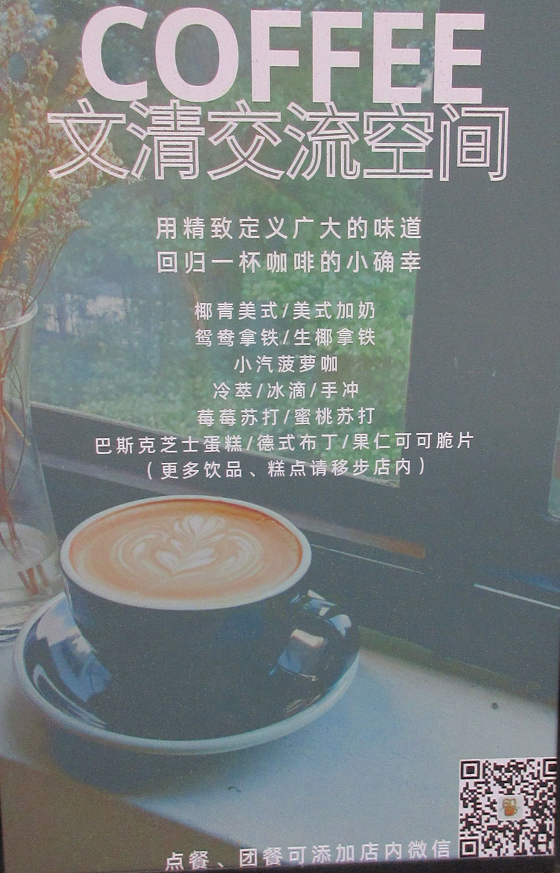 广大教学区文清楼交流空间COFFEE最新供应推荐:椰青美式&美式加奶&鸳鸯拿铁&生椰拿铁&小汽菠萝咖 冷萃&冰滴&手冲 草莓苏打&蜜桃苏打 巴斯克芝士蛋糕&德式布丁&果仁可可脆片 更多饮品,糕点请到店内详知 点餐、团餐可添加店内微信