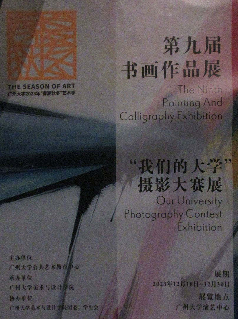 | 广州大学教学区东部 演艺中心 有个第九届书画作品展及我们的大学摄影展 时间从12.18-12.30 | ||||||
