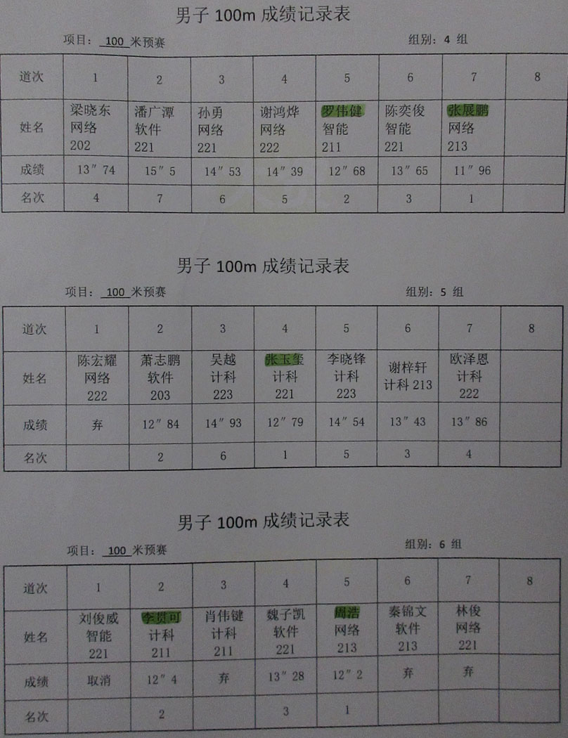 | 2022.10.22广大四院联合运动会 男子100米预赛(6个小组)成绩记录表 | ||||||
