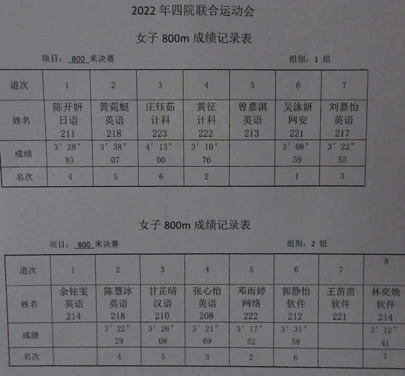2022.10.22广大四院联合运动会 女子800米决赛(2组)成绩记录表 第一名 3分08秒59 吴泳妍 网安221 第二名 3分10秒76 黄征 计科222 第三名 3分12秒41 林奕焕 软件214 第四名 3分17秒52 邓雨婷 网络222 第五名 3分21秒69 张心怡 英语208 第六名 3分22秒29 陈慧冰 英语218 第七名 3分22秒55 刘嘉怡 英语217 第八名 3分26秒08 甘芷晴 汉语210 |