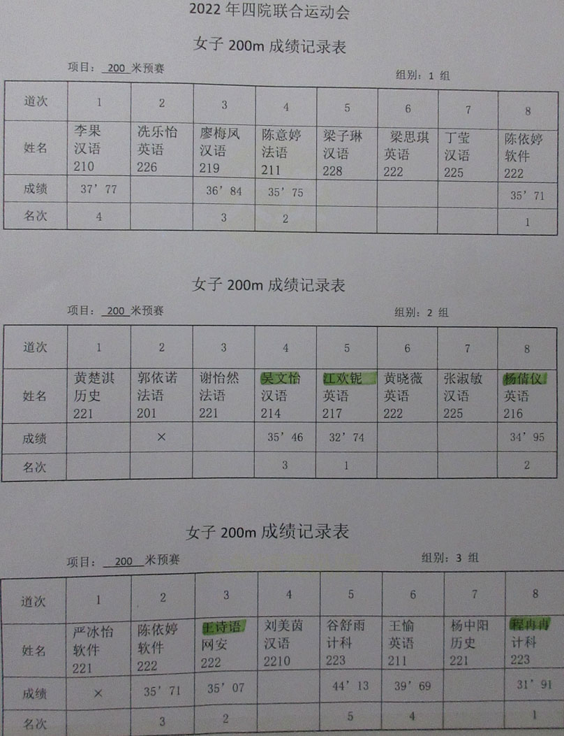 2022.10.22广大四院联合运动会 女子200米预赛(3组)成绩记录表