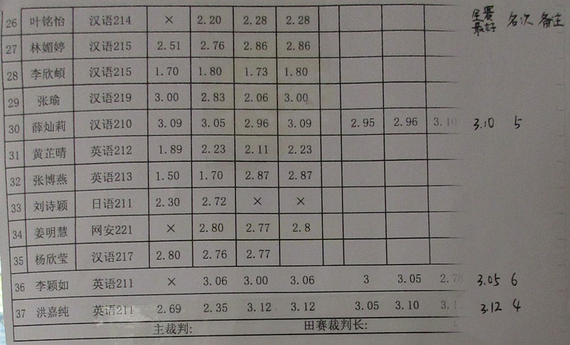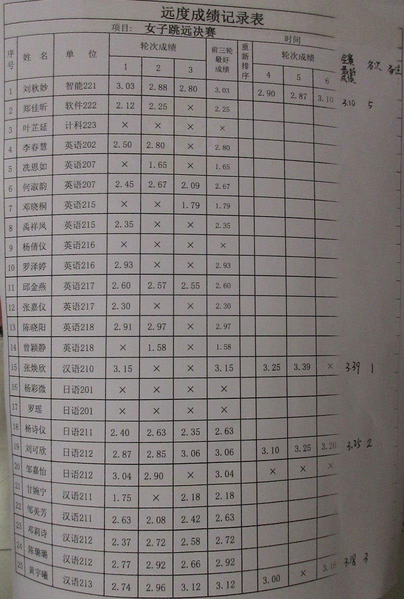 计算机、外国语、人文、网安四院联合运动会 女子跳决赛-远度成绩记录表