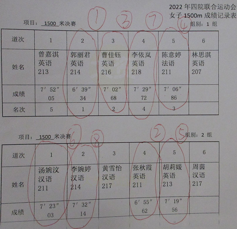 2022.10.22广大四院联合运动会 女子1500米决赛(2个小组)成绩记录表 第一名:郭丽君 6分39秒34 英语214 第二名:张秋霞 6分55秒62 英语211 第三名:曹佳钰 7分02秒68 英语216 第四名:陈意婷 7分06秒86 法语211 第五名:胡莉媛 7分19秒56 英语213 第六名:汤婉汶 7分23秒03 汉语211 第七名:李依岚 7分29秒72 英语218 第八名:李婉婷 7分32秒14 汉语214 |