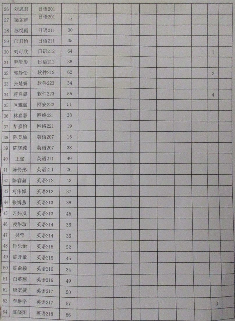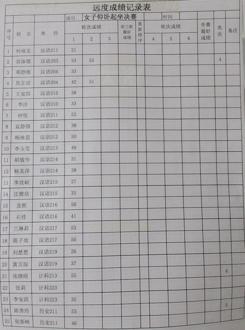 计算机、外国语、人文、网安四院联合运动会 女子仰卧起坐决赛-次数成绩记录表