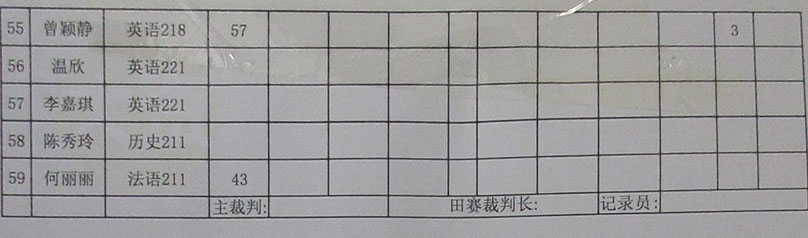 计算机、外国语、人文、网安四院联合运动会 女子仰卧起坐决赛-次数成绩记录表 第一名:刘可欣 64次 日语212 第二名:郭静怡 62次 软件212 第三名:李琳宇 57次 英语217 第三名:曾颖静 57次 英语218 第四名:宾泳珊 55次 汉语203 第四名:张晓晴 55次 计科213 第四名:蒋启晨 55次 软件223 第五名:陈秀玲 53次 历史211 |