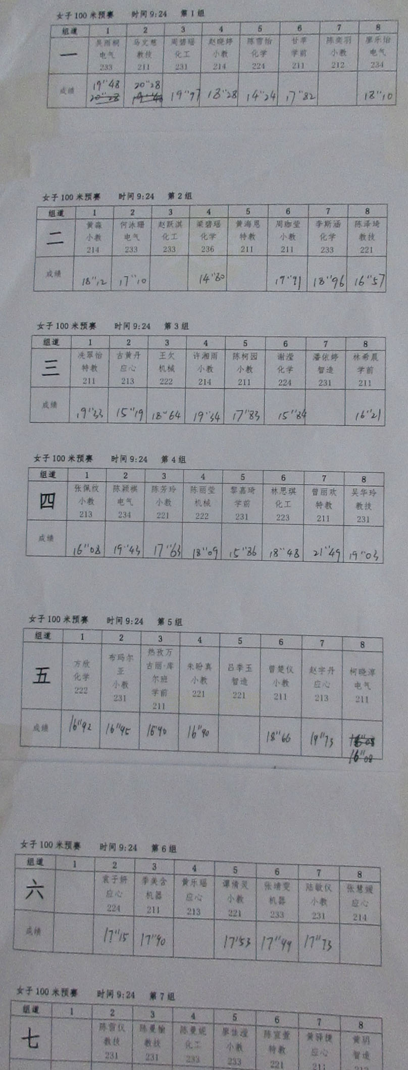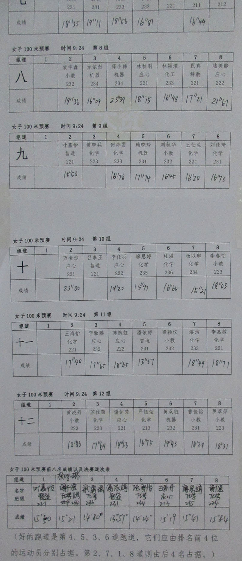 广州大学2023年教育学院 机电学院 化学学院三院联合田径运动会 女子100米预赛各小组计时成绩及最终进入决赛八名选手&道次跑位