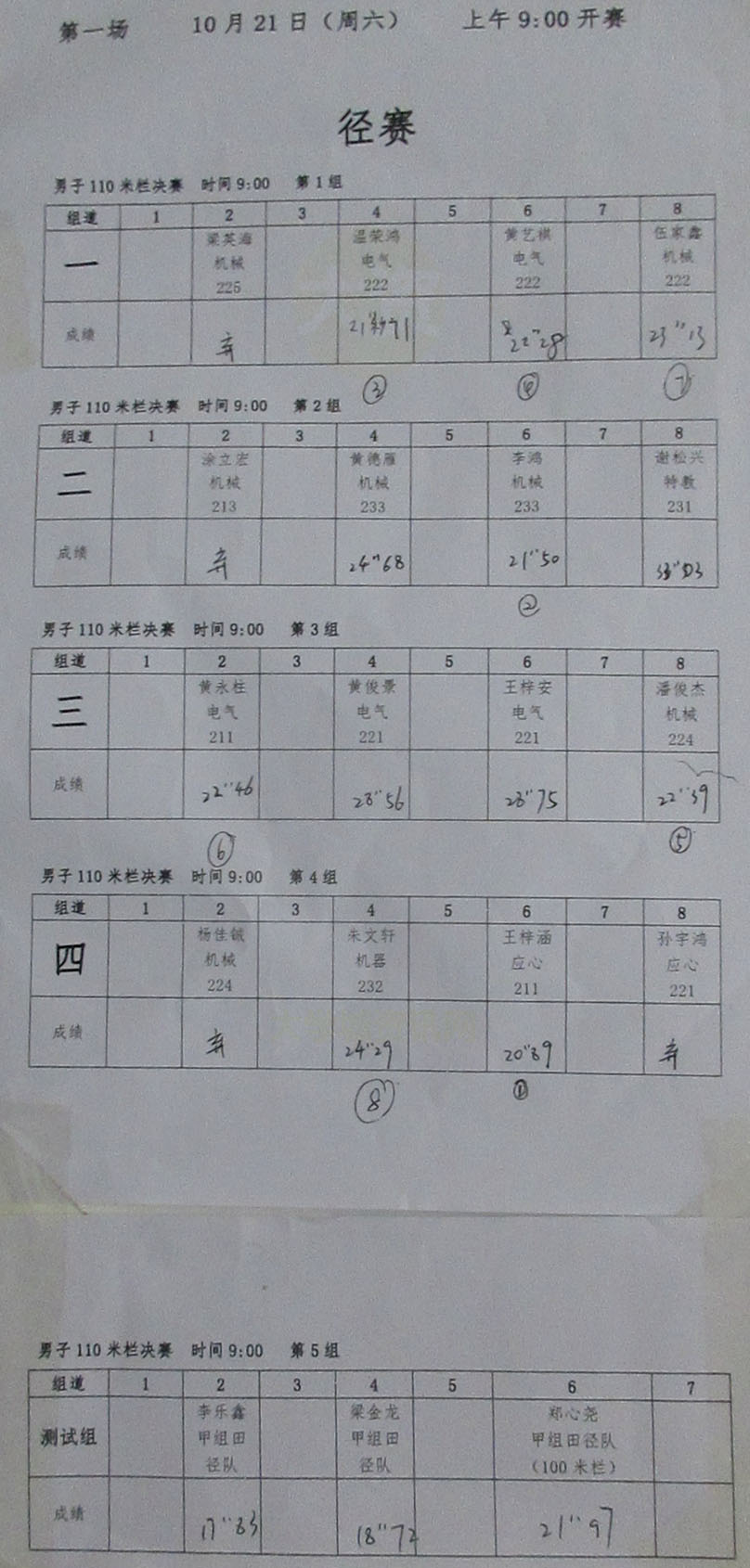 | 广州大学2023年教育学院 机电学院 化学学院三院联合田径运动会 男子110米栏决赛前八名&各组成绩 | ||||||