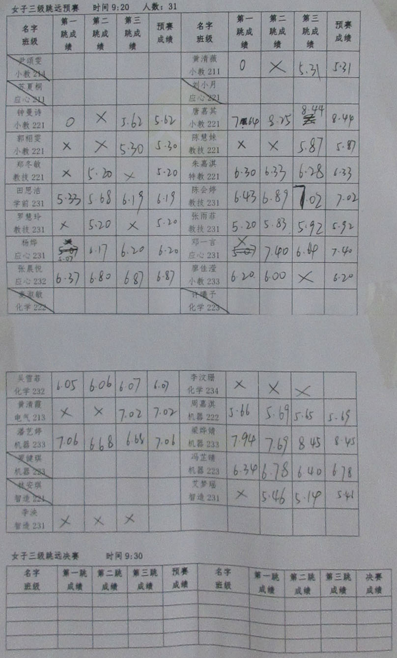 广州大学2023年教育学院 机电学院 化学学院三院联合田径运动会 女子三级跳远预赛成绩 |