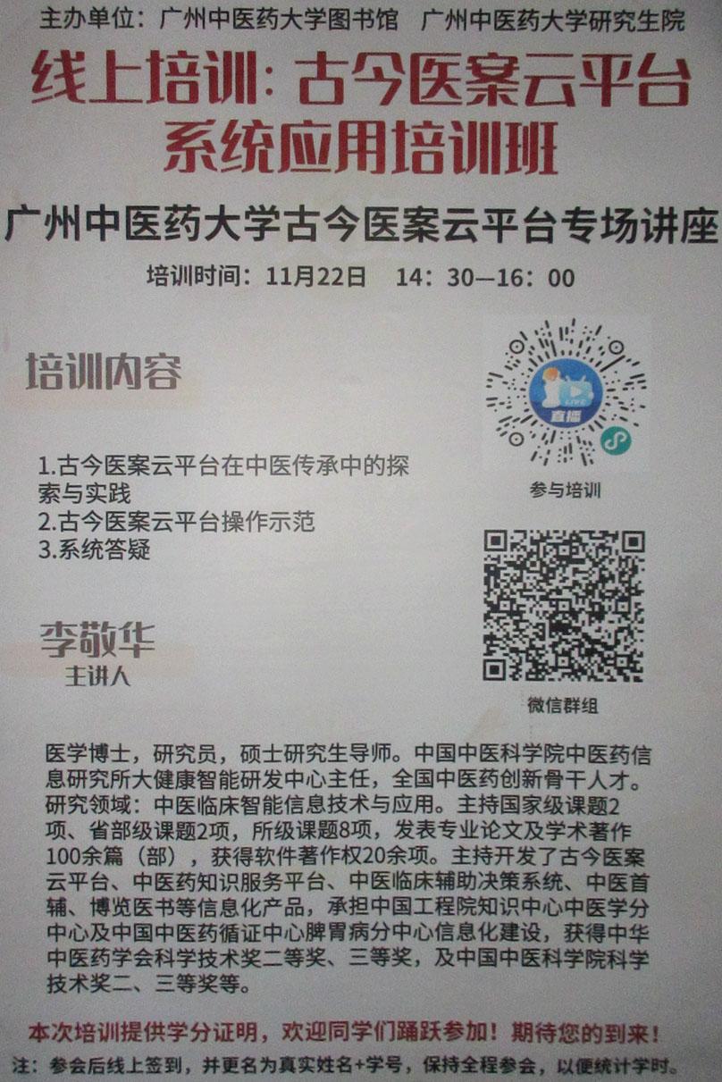 | 广州中医药大学古今医案云平台专场讲座&古今医案云平台系统应用线上培训班 11月22日周二下午14点30-16点 主讲人-李敬华 扫码参与培训&加入群组 本次培训还提供学分证明 | ||||||