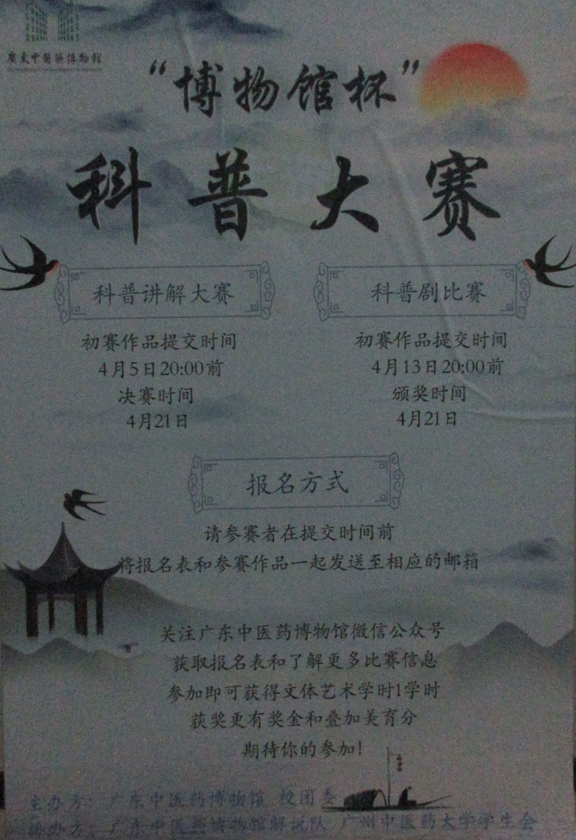 广中医博物馆杯科普大赛 科普讲解大赛初赛作品提交于4.5晚8点前 科普剧比赛初赛作品提交于4.13晚8点前 决赛&颁奖4月21日 |