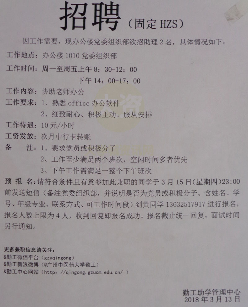 | [招聘] | (固定 HZS)因工作需要,现办公楼党委组织部欲招助理2名 2018年3月13日 | ||||||
