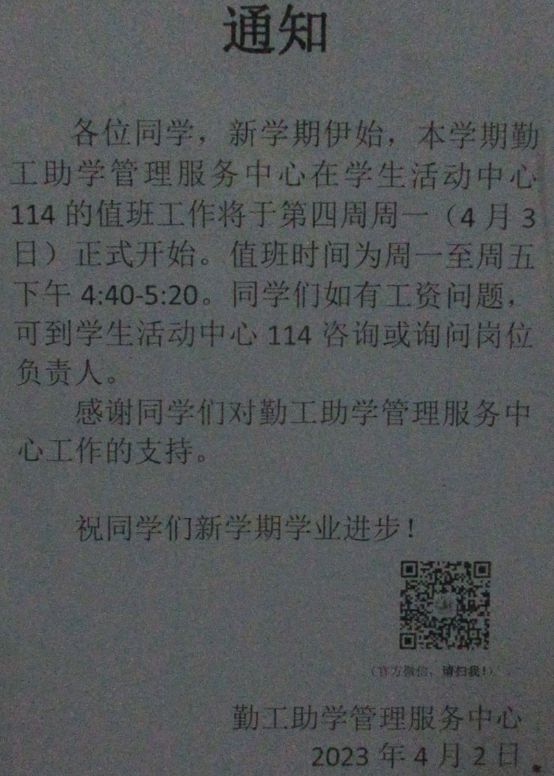 广中医勤工助学管理服务中心 新学期在学生活动中心114室值班于4月3日周一开始 具体为每天下午4点40-5点20 |