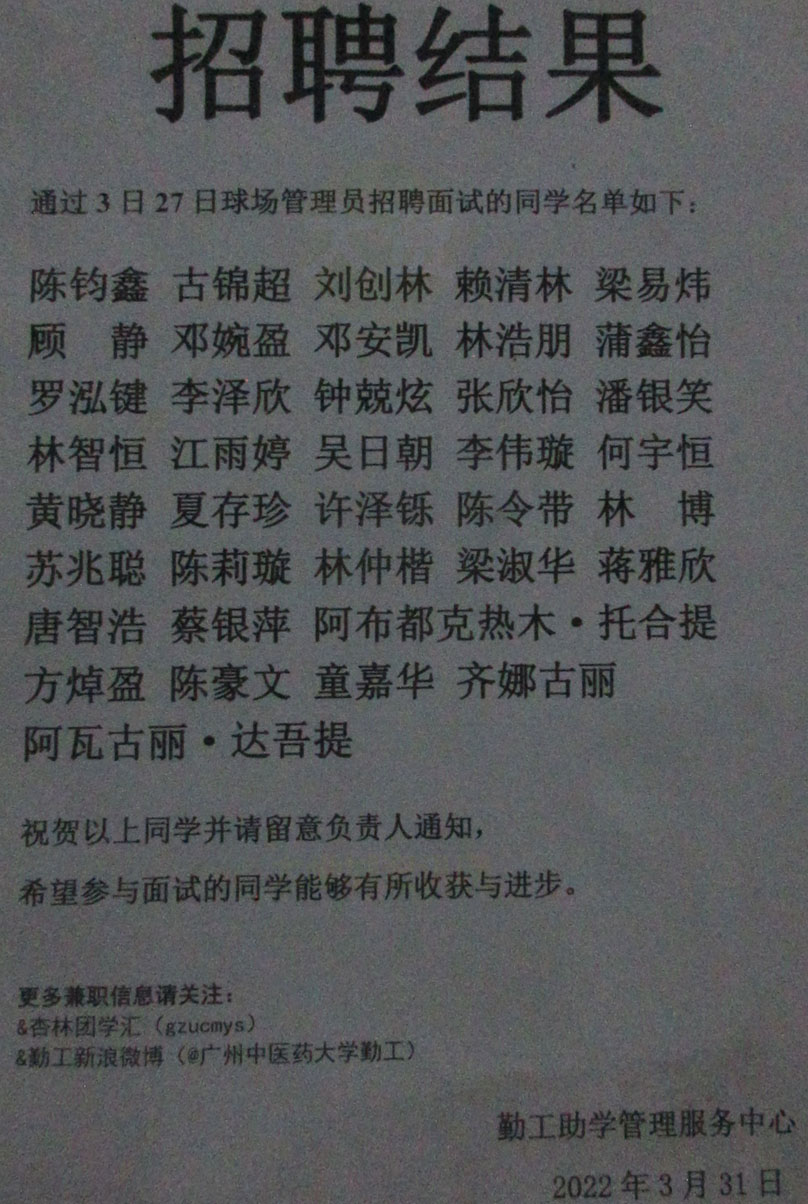 | 招聘结果公示 通过3月27日球场管理员招聘面试的学生名单 2023年3月31日 勤工助学管理服务中心 | ||||||
