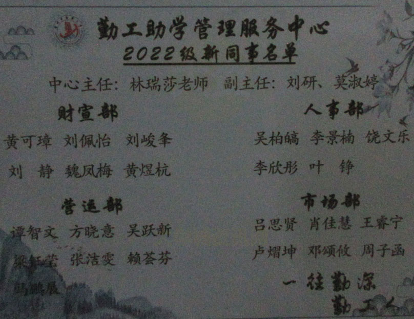 广中医勤工助学管理服务中心2022级新成员名单 中心主任林瑞莎老师 副主任刘研,莫淑婷 财宣部 人事部 营运部 市场部 |